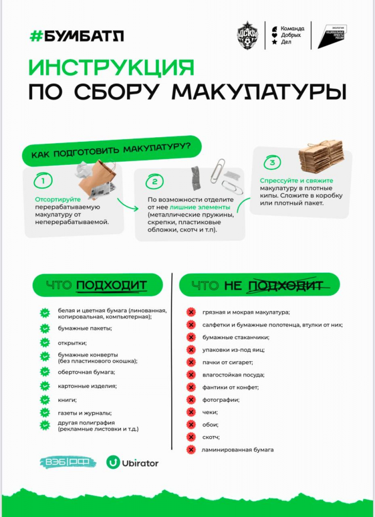 Важно: бумага и картон должны быть чистыми (без жирных, грязных пятен), без скрепок, наклеек, пластиковых элементов, скотча. Прежде чем принести свой «макулатурный запас», аккуратно все сложите, свяжите макулатуру в плотные кипы, упакуйте в коробку или плотный пакет (желательно в бумажный, либо в пластиковый, но перед сдачей макулатуру нужно будет из него вытащить).