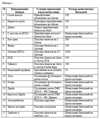 3.2. Биткони за участие в Программе лояльности ПФК ЦСКА начисляются в порядке и размерах, предусмотренных Таблицей 1. Срок начисления Битконей может составлять до 5 (пяти) рабочих дней.