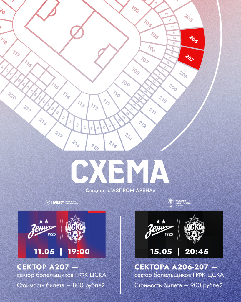 Билеты в сектор болельщиков ПФК ЦСКА (А206-207) можно приобрести онлайн, зарегистрировавшись по ссылке: https://tickets.fc-zenit.ru/promo/