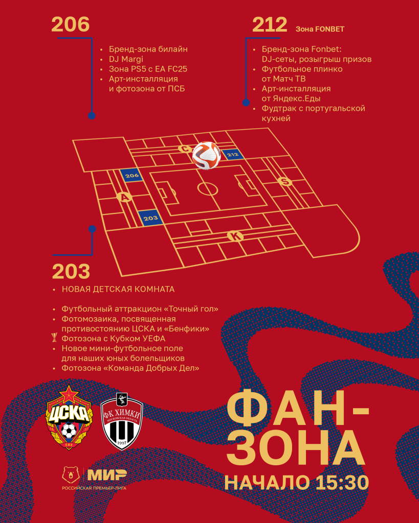 Перед выходом на 212 сектор гости стадиона увидят бренд-зону от нашего партнера Fonbet, футбольное плинко от Матч ТВ, арт-инсталляцию от Яндекс.Еды.
