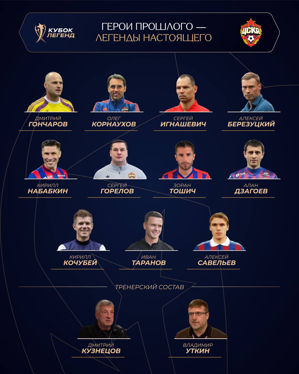 Новости клубаЗа команду легенд ЦСКА выступят: Дмитрий Гончаров, Олег Корнаухов, Сергей Игнашевич, Алексей Березуцкий, Кирилл Набабкин, Сергей Горелов, Зоран Тошич, Алан Дзагоев, Кирилл Кочубей, Иван Таранов, Алексей Савельев.