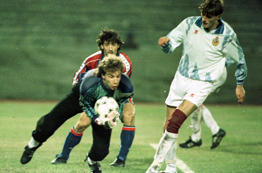 Дмитрий Харин и Валерий Минько в матче против "Барселоны" в "Лужниках"